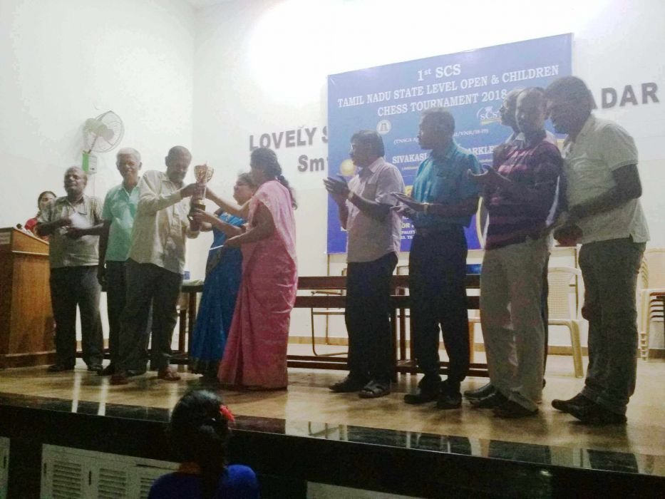 Kirpesh of Sivakasi Chess Club receives the Chess 960 trophy from U Chockalingam Balaji IA