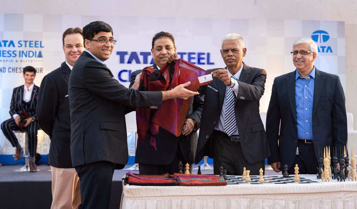 IA Anantharam with Anand drawing his number in the opening ceremony of Tata Steel Chess 2019 tournament